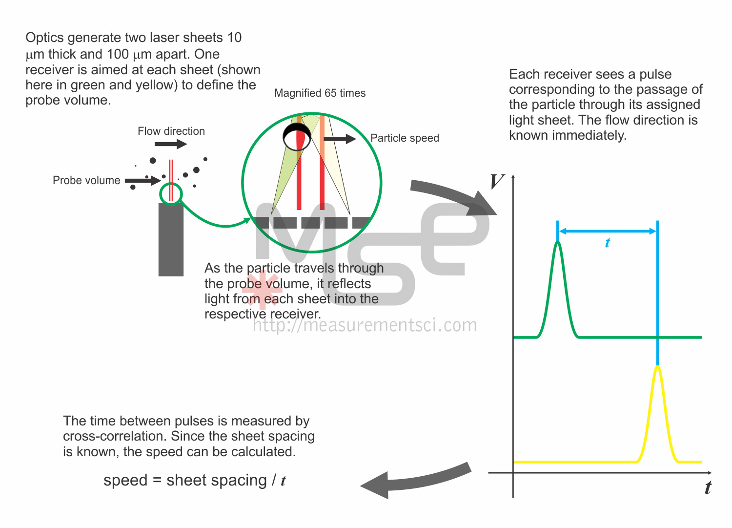 A “time-of-flight” sensor measures velocity by timing the occurrence of two events. In the case of the microV, these events are the crossing of two distinct miniature laser sheets by a particle. By knowing the spacing between the laser sheets in physical space, the velocity can be calculated by the simple relationship velocity = distance / time.
