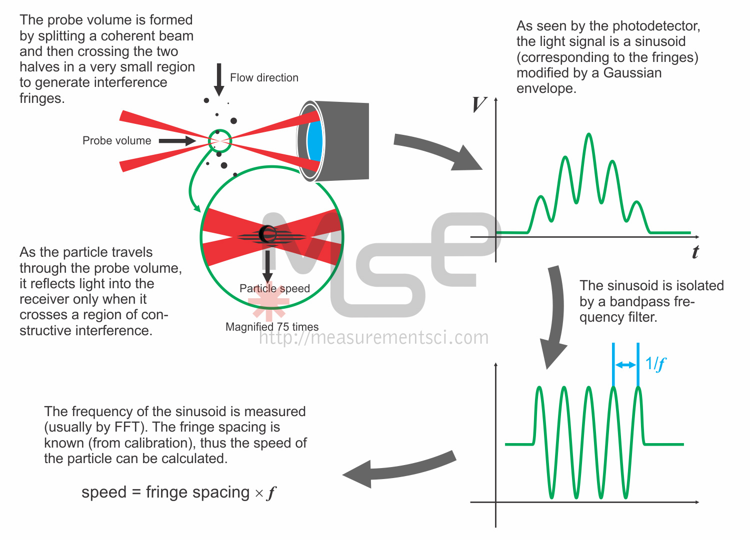 The fringes formed by the interference of the beams is a pattern of light in space. When a particle passes through the probe volume, it goes through the light and dark regions, so if its reflected light is measured as it travels along, the intensity versus time curve looks like a sinusoid with a Gaussian envelope. The Gaussian envelope comes from the fact that the intensity of the beams is Gaussian in nature. The sinusoid is the physical travel of the particle through the fringes. The physical distance between the fringes is known from the calibration which is performed with every probe. So the frequency of the intensity signal is directly proportional to the velocity of the particle: velocity = fringe spacing x intensity frequency.